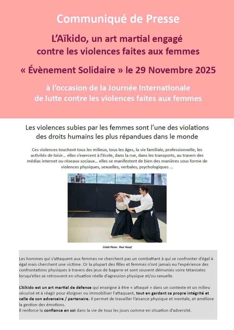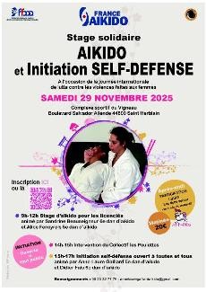 A l'occasion de la Journée Internationale des Luttes contre les violences faites aux femmes, retrouvez en téléchargement l'affiche d'un stage d'aïkido (le matin) suivi d'une initiation self défense (l'après-midi) - qui se déroulera le 29 Novembre 2025 à SAINT HERBLAIN (44)