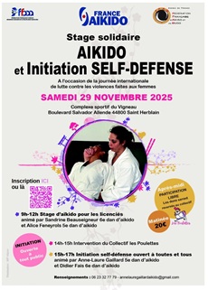 A l'occasion de la Journée Internationale des Luttes contre les violences faites aux femmes, retrouvez en téléchargement l'affiche d'un stage d'aïkido (le matin) suivi d'une initiation self défense (l'après-midi) - qui se déroulera le 29 Novembre 2025 à SAINT HERBLAIN (44)