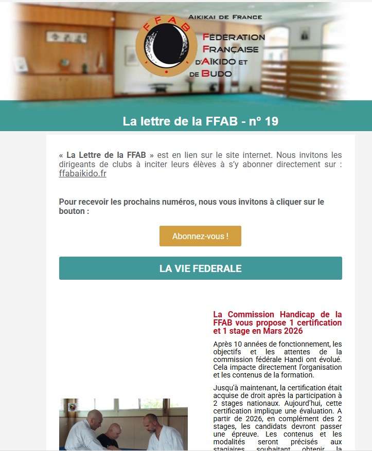Nous invitons les dirigeants de clubs à inciter leurs élèves à s'y abonner directement sur le site fédéral www.ffabaikido.fr en bas de la colonne de droite - Inscrivez-vous à notre newsletter
